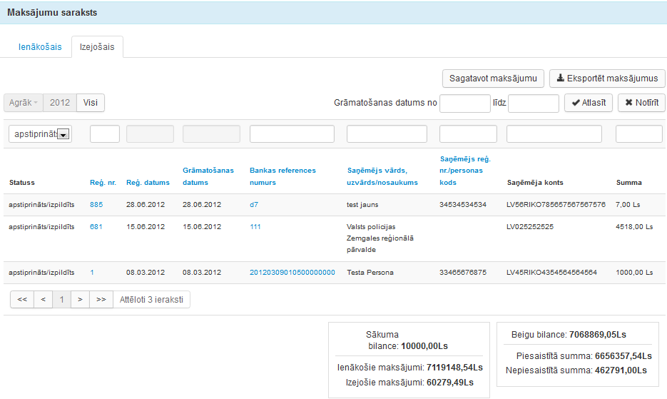 4. Ieraksts tiek saglabāts Maksājuma ierakstu saraksta sadaļā Izejošie maksājumi