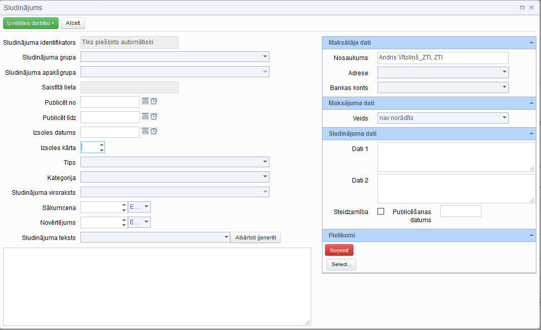 Jauna sludinājuma ieraksta reģistrēšanu iespējams veikt no reģistrētas izpildu lietas kartiņas, saistīto ierakstu apakšsadaļas Datu publicēšana. Sludinājuma reģistrācijas datu ievadi iespējams uzsākt pēc nospiestas pogas Izveidot sludinājumu, kā rezultātā tiek atvērta sludinājuma datu ievades kartiņa, kurā aizpildām nepieciešamos + obligātos datu ievades laukus.