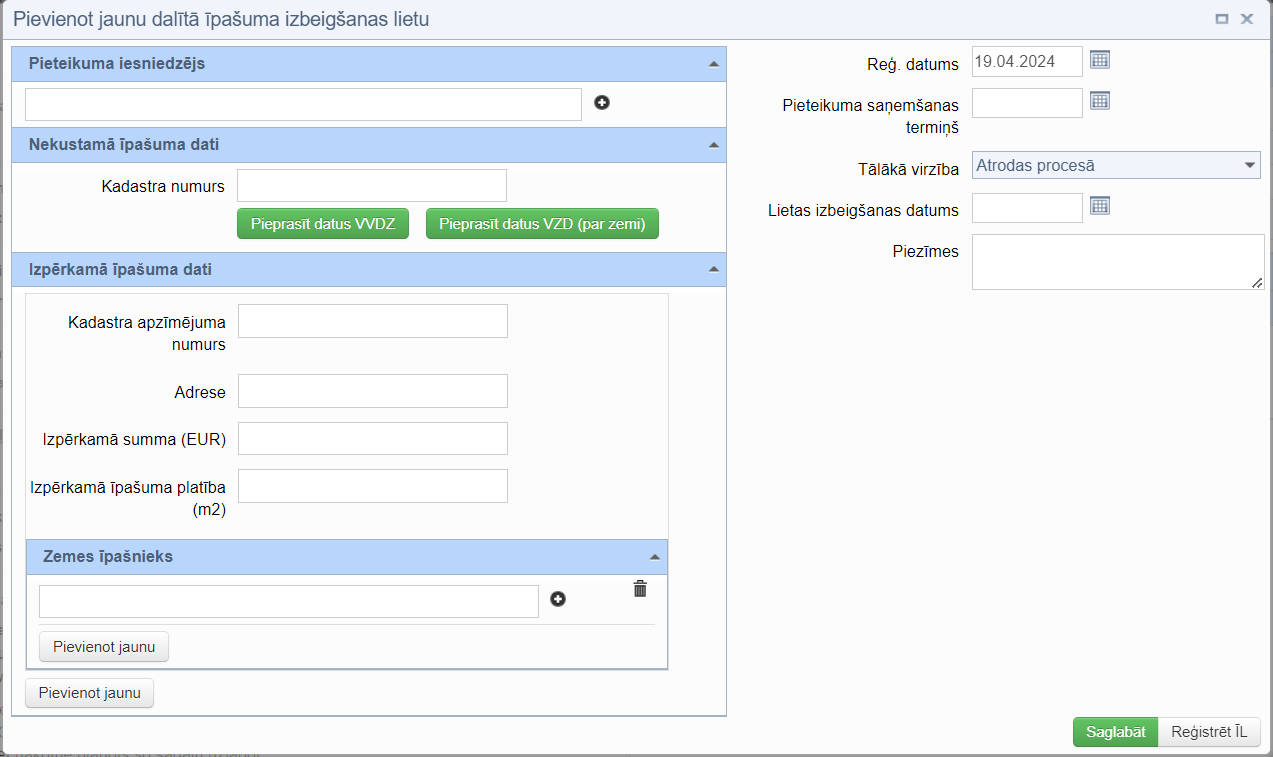 | Reģistrēt ĪL | Poga | Nodrošina dalītā īpašuma izbeigšanas lietas kartiņā ievadītās informācijas sagalabāšanu dalītā īpašuma lietu reģistrā. Gadījumos, kad netiek aizpildīti visi obligātie kartiņas ievadlauki, attiecīgais lauks tiek iekrāsots sarkanā tonī. Saglabāto informāciju iespējams atvērt no izpildu lietu ierakstu saraksta. |