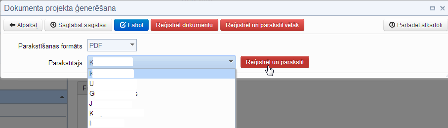 (nospiesta poga Reģistrēt un parakstīt)Rezultātā Dokumentu projekta ģenerēšanas logā tiek piedāvāta iespēja veikt parakstīšanu. Izvēloties nepieciešamo parakstīšanas formātu un parakstītāju, pēc nospiestas pogas Reģistrēt un parakstīt tiek reģistrēts un parakstīts nosūtītais dokuments.