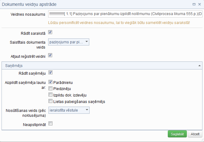 - Rādīt saņēmēju - nodrošina Saņēmēja bloka ne-/attēlošanu Dok.projekta ģen.procesa logā izvēloties konkrēto veidni;