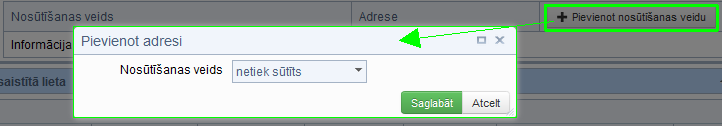Katrai personai individuāli iespējams ievadīt vairākus nosūtīšanas veidus. Pēc pogas Pievienot nosūtīšanas veidu tiek atvērts modālais logs Pievienot adresi, kurā iespējams norādīt vairākas adreses/e-pastus/faksa numurus.Pēc noklusējuma ievadlauka Nosūtīšanas veids vērtība ir 'netiek sūtīts'.