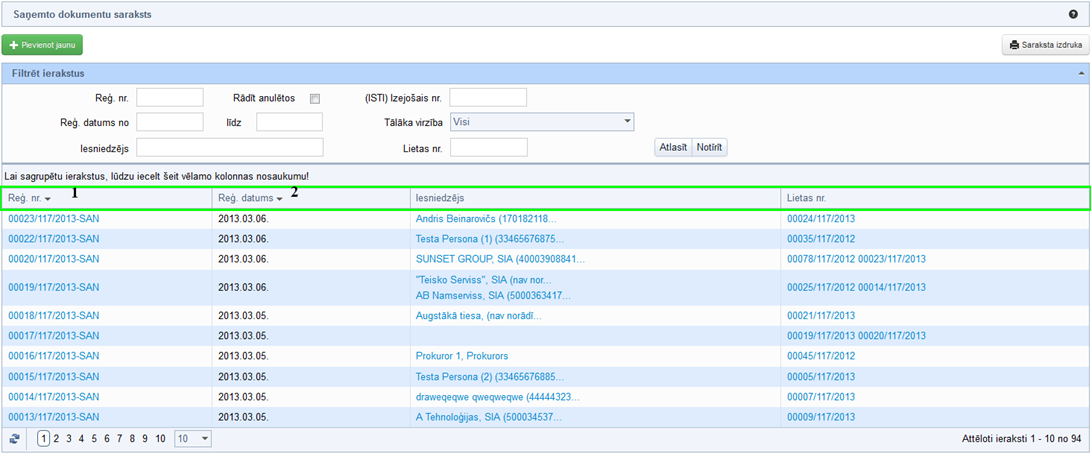 - Pēc noklusējuma ieraksti vienmēr tiek kārtoti pēc Izpildu lietas nr. un Reģ.datums (apzīmēts ar trijstūra ikonu).