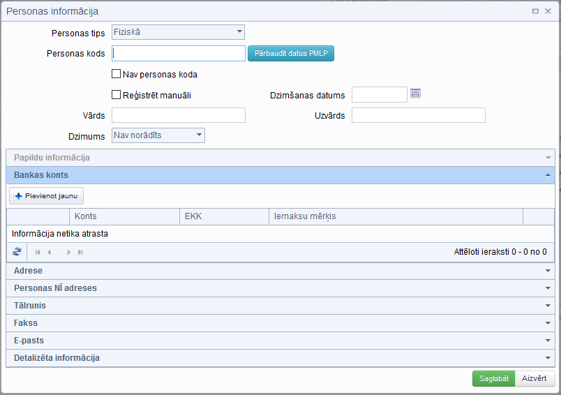Pēc nepieciešamo/obligāto ievadlauku aizpildes iespējams veikt personas ieraksta reģistrēšanu – nospiesta poga Saglabāt.